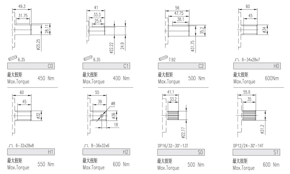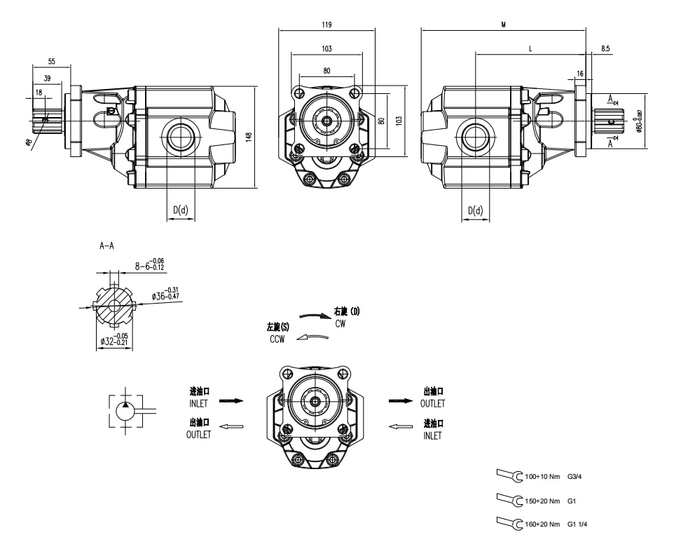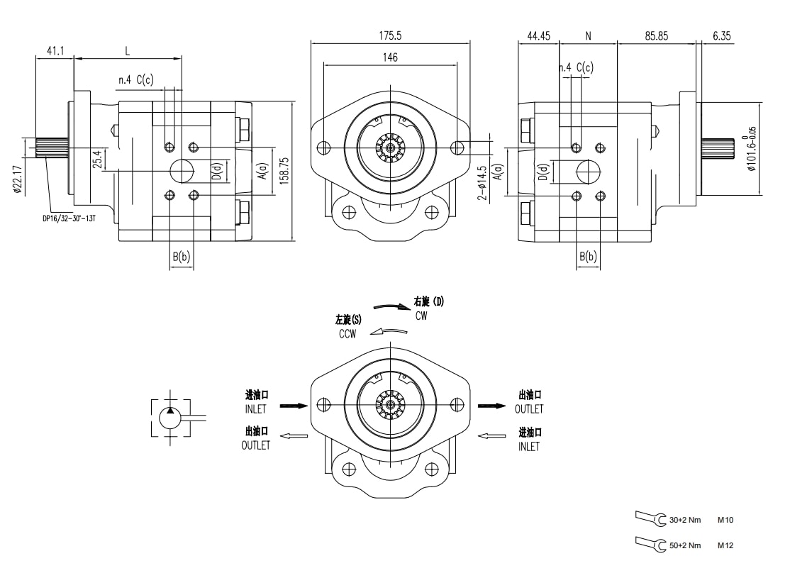 | 排量 | 最大壓力 | 最高轉速 | 最低轉速 | 重量 | 尺寸 | 油口代碼 | 進油口 | 出油口 | |||
