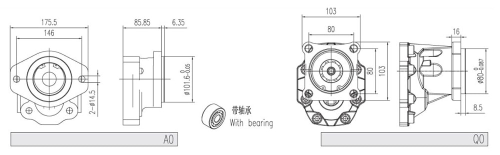 | 排量 | 最大壓力 | 最高轉速 | 最低轉速 | 重量 | 尺寸 | 油口代碼 | 進油口 | 出油口 | |||||||||