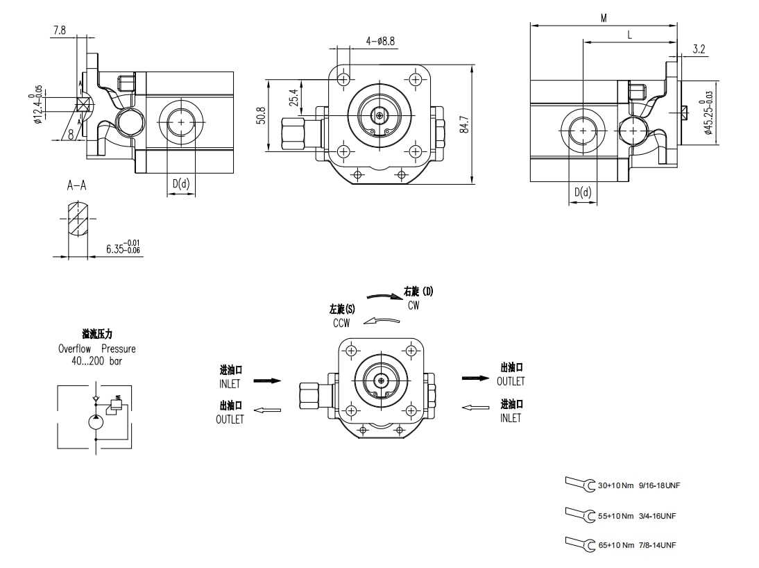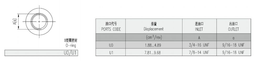 | 排量 | 最大壓力 | 最高轉速 | 最低轉速 | 重量 | 尺寸 | 油口代碼 | 進油口 | 出油口 | |||