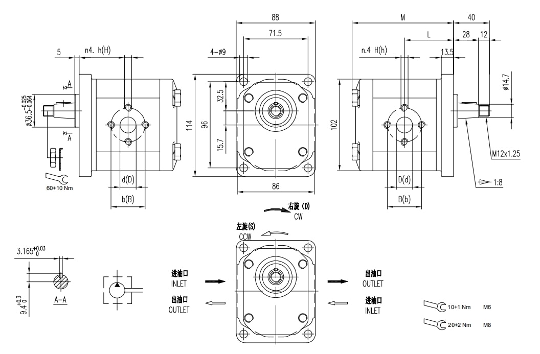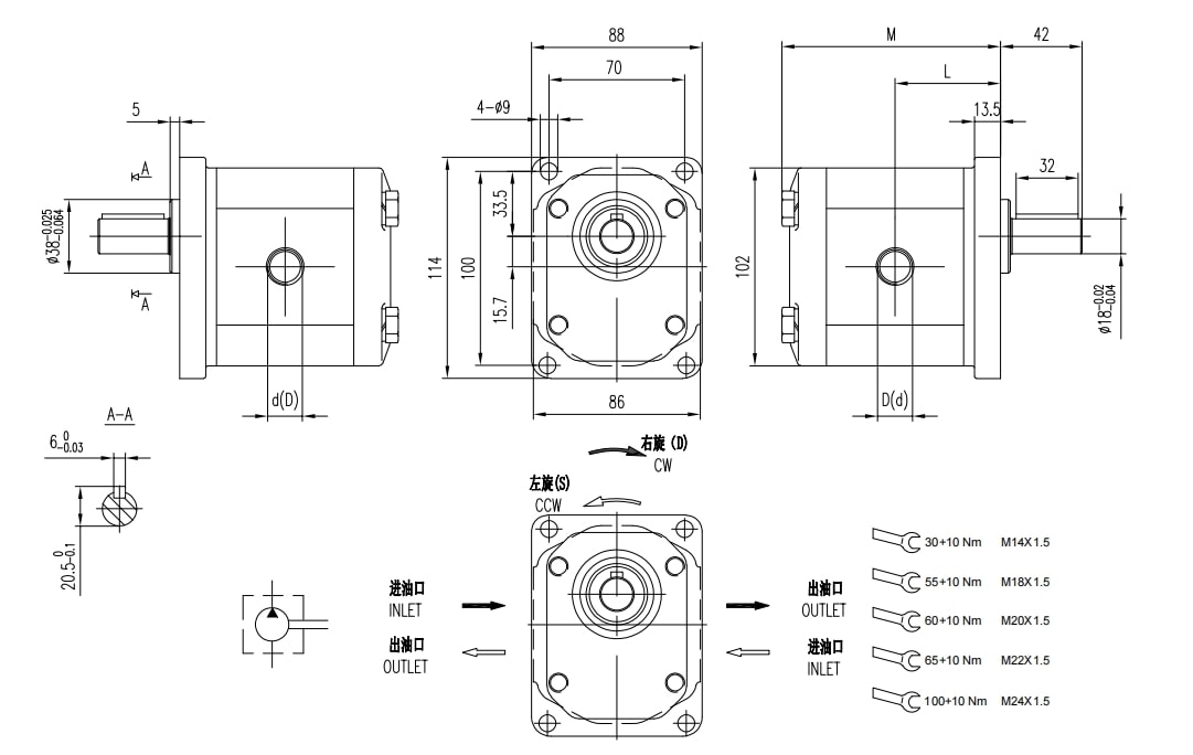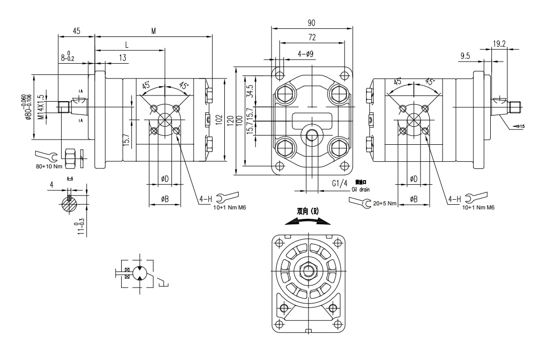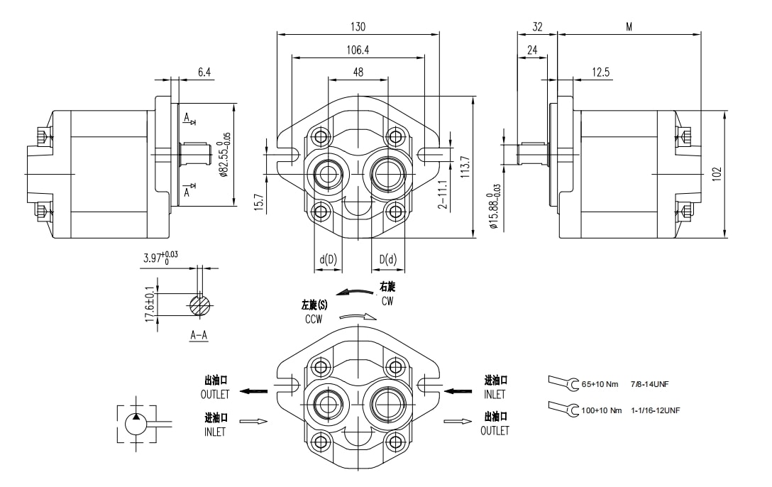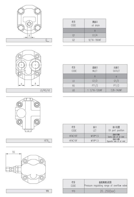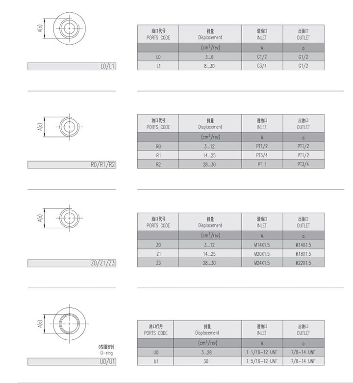 | 排量 | 最大壓力 | 最高轉速 | 最低轉速 | 重量 | 尺寸 | 油口代碼 | 進油口 | 出油口 | |||