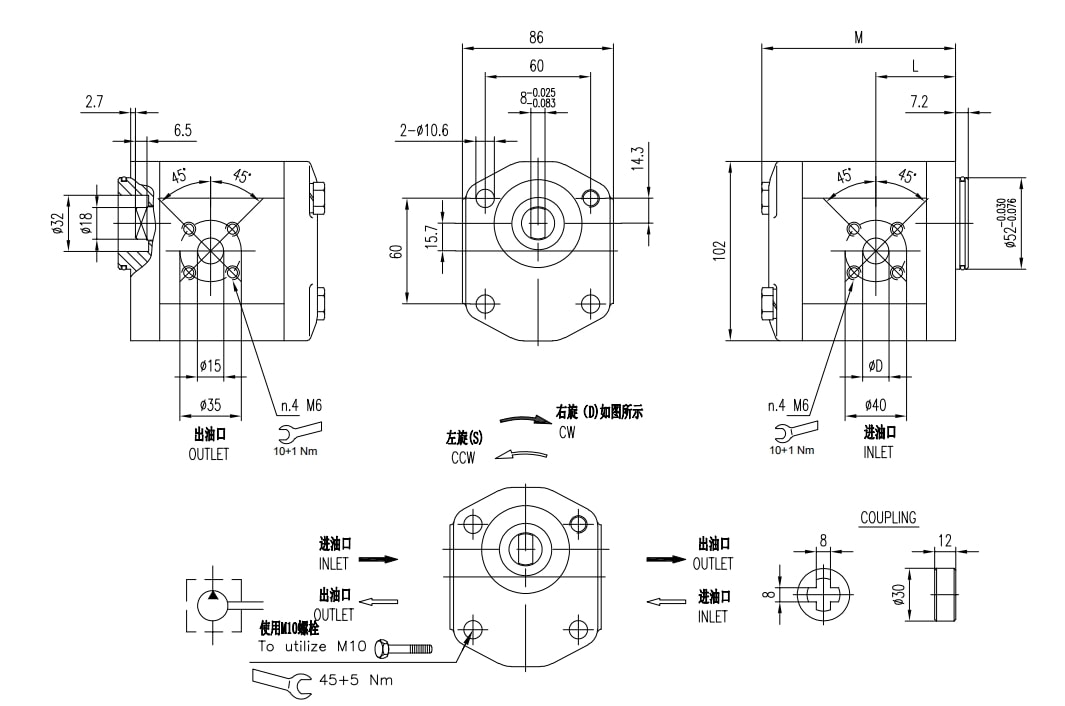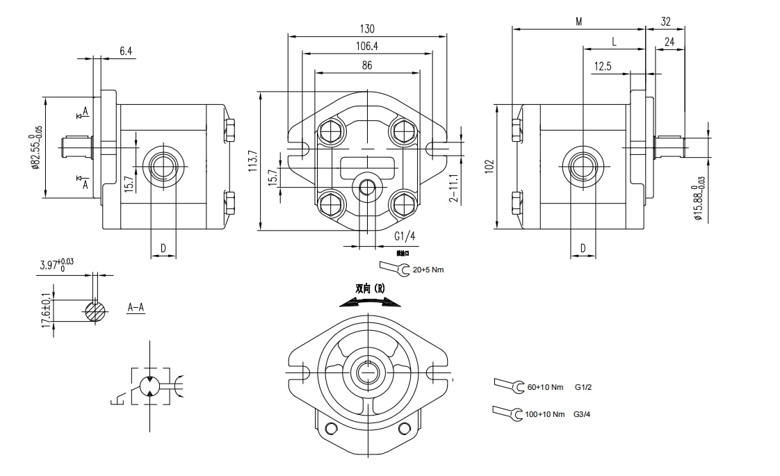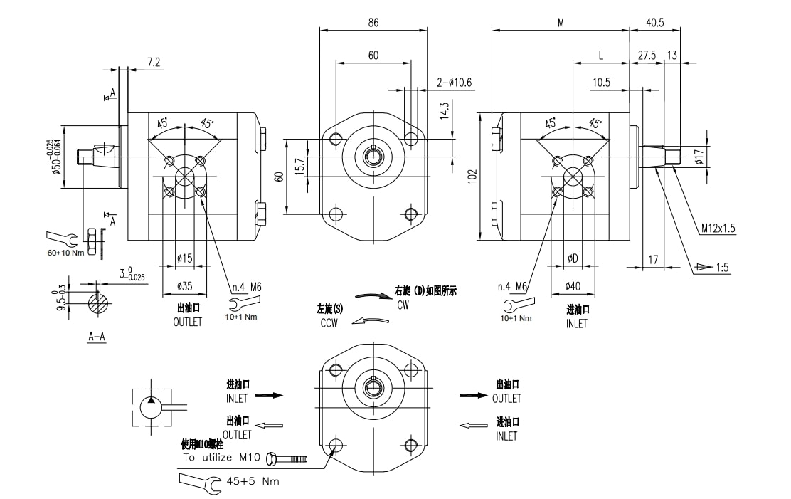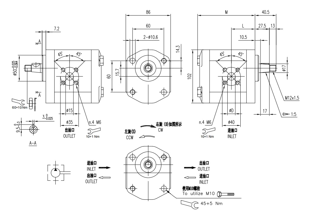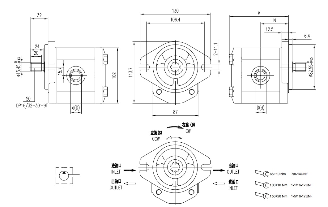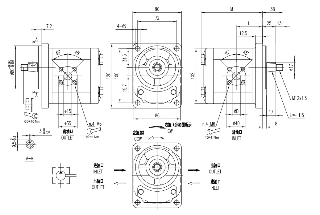 | 排量 | 最大壓力 | 最高轉速 | 最低轉速 | 重量 | 尺寸 | 油口代碼 | 進油口 | 出油口 | |||
