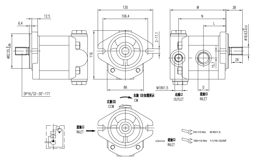 | 18 | 250 | 265 | 280 | 3200 | 400 | 4.15 | 128 | U0 | 1/16-12UNF | 7/8-14UNF |