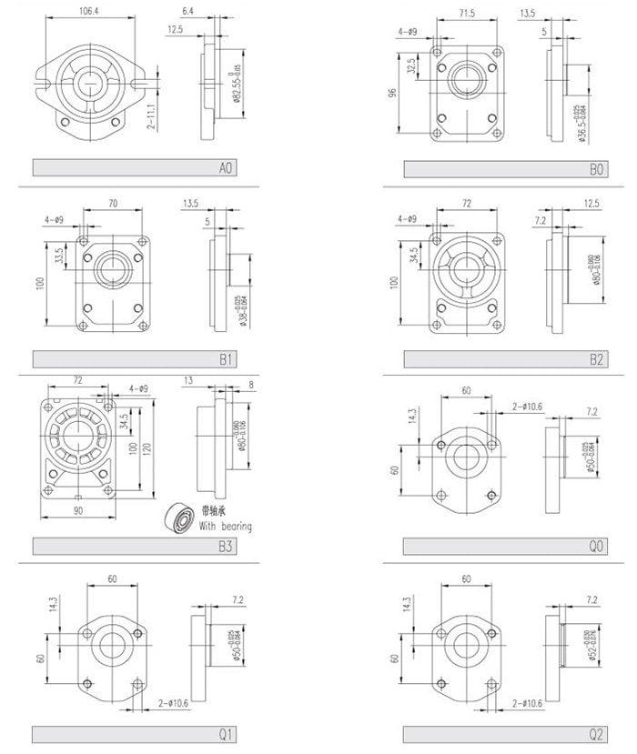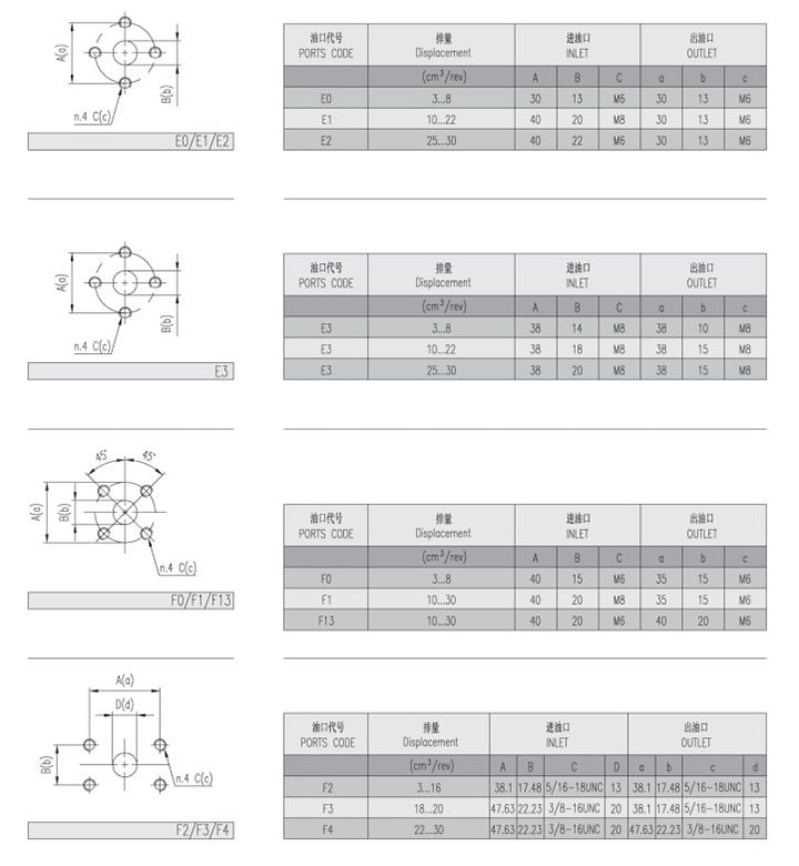 | 排量 | 最大壓力 | 最高轉速 | 最低轉速 | 重量 | 尺寸 | 油口代碼 | 進油口 | 出油口 | ||