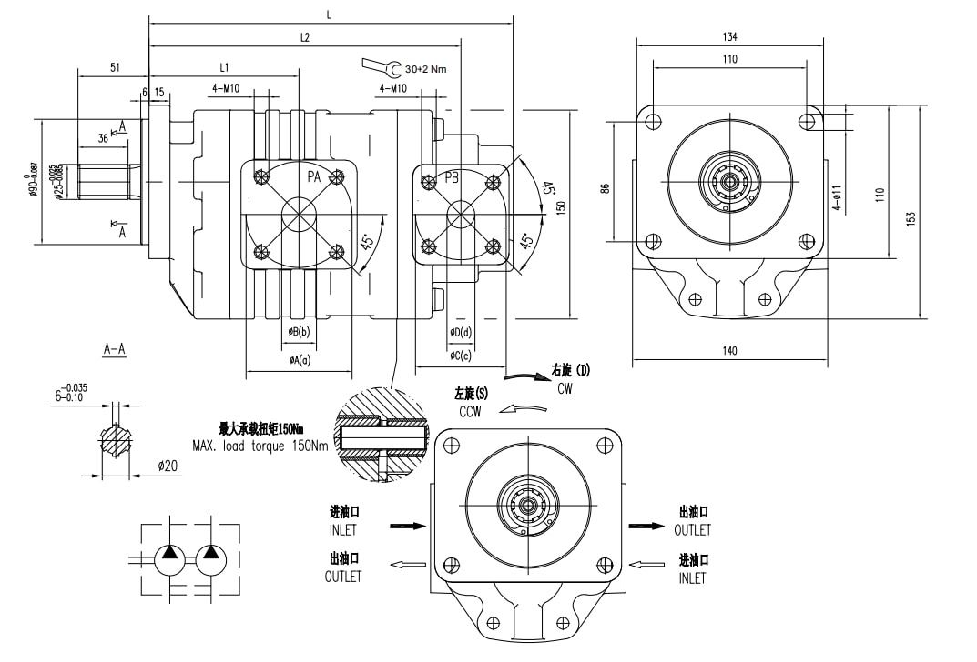 | 排量 | 最大壓力 | 最高轉(zhuǎn)速 | 最低轉(zhuǎn)速 | 尺寸 | 油口代碼 | 進油口 | 出油口 | 油口代碼 | 進油口 | 出油口 | ||||||||