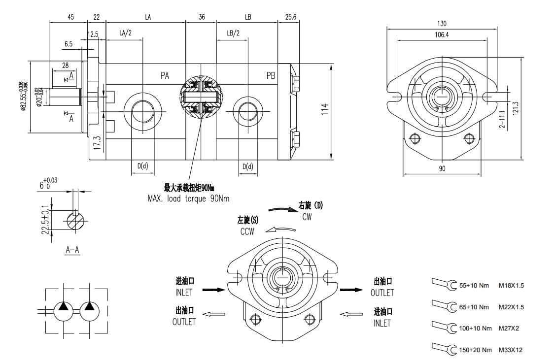| 排量 | 最大壓力 | 最高轉(zhuǎn)速 | 最低轉(zhuǎn)速 | 尺寸 | 油口代碼 | 進(jìn)油口 | 出油口 | 油口代碼 | 進(jìn)油口 | 出油口 | |||