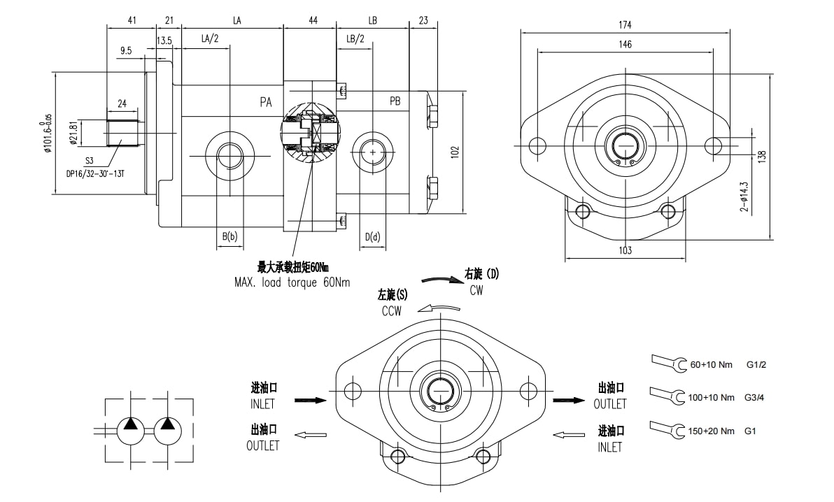 | 排量 | 最大壓力 | 最高轉速 | 最低轉速 | 尺寸 | 油口代碼 | 進油口 | 出油口 | 油口代碼 | 進油口 | 出油口 | |||