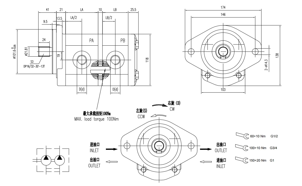 | 排量 | 最大壓力 | 最高轉速 | 最低轉速 | 尺寸 | 油口代碼 | 進油口 | 出油口 | 油口代碼 | 進油口 | 出油口 | |||
