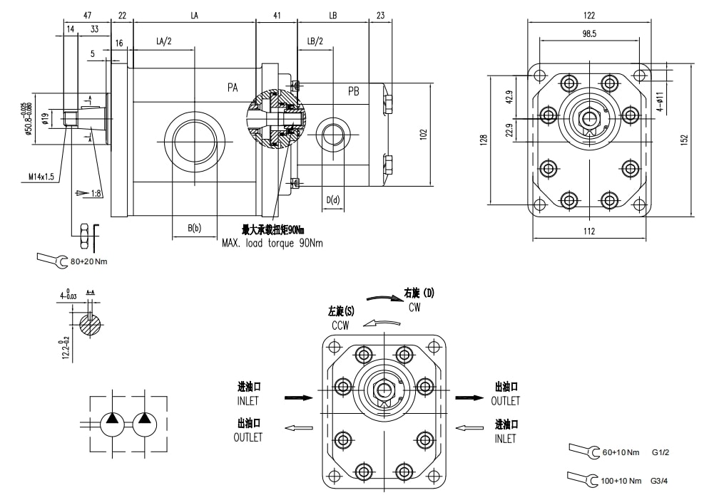 | 排量 | 最大壓力 | 最高轉速 | 最低轉速 | 尺寸 | 油口代碼 | 進油口 | 出油口 | 油口代碼 | 進油口 | 出油口 | |||
