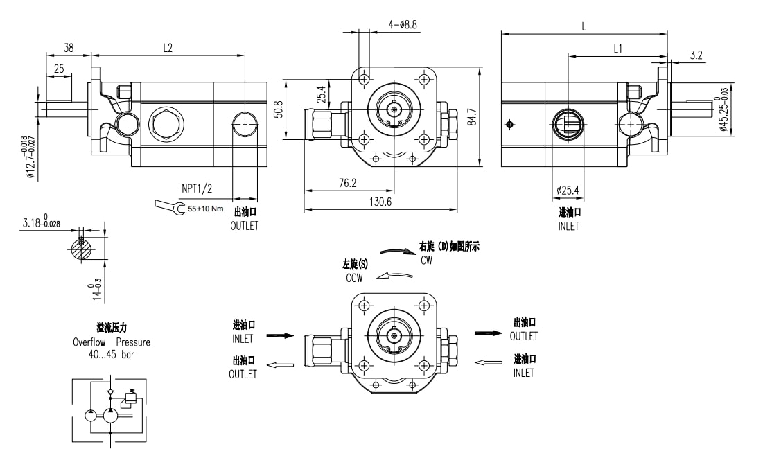 | 排量 | 最大壓力 | 溢流壓力 | 最高轉速 | 最低轉速 | 重量 | 尺寸 | 油口代碼 | 進油口 | 出油口 | ||||||