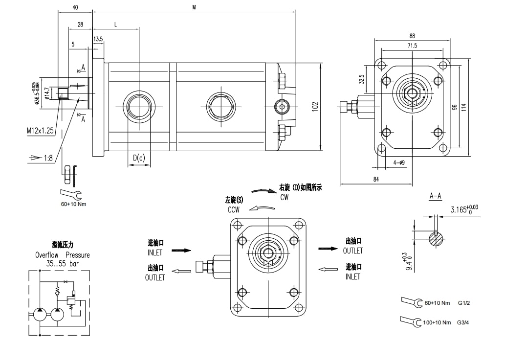 | 排量 | 最大壓力 | 溢流壓力 | 最高轉速 | 最低轉速 | 尺寸 | 油口代碼 | 進油口 | 出油口 | ||||